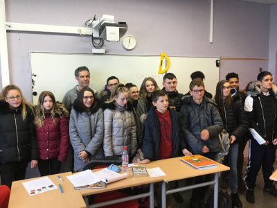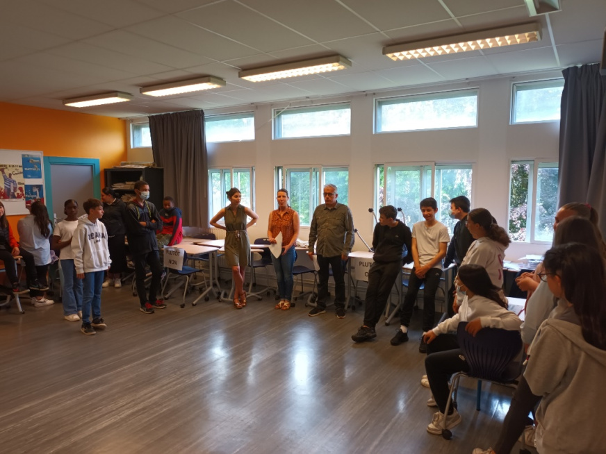 La classe de Mme Riou participait pour la sélection 6e/5e et deux élèves s’étaient portés volontaires pour défendre le vote de la classe à cette réunion : Anaïs et Yanis. :-)